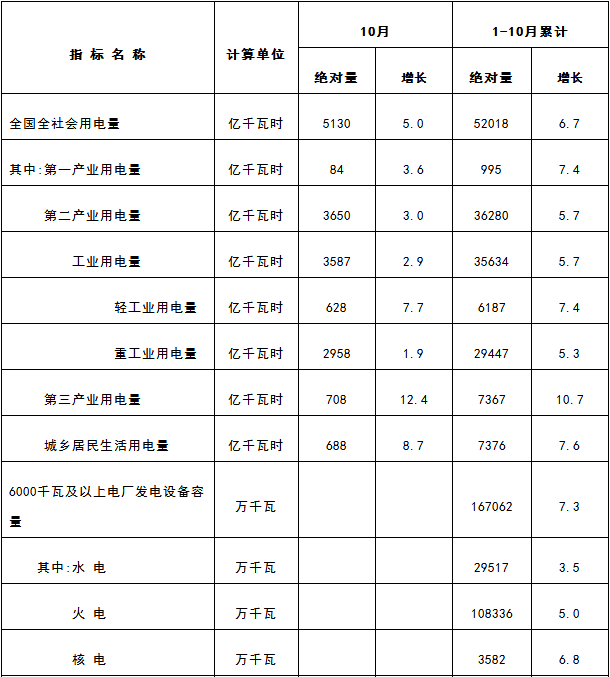11月22日,國家能源局發布1-10月份全國電力工業統計數據,具體情況如下: