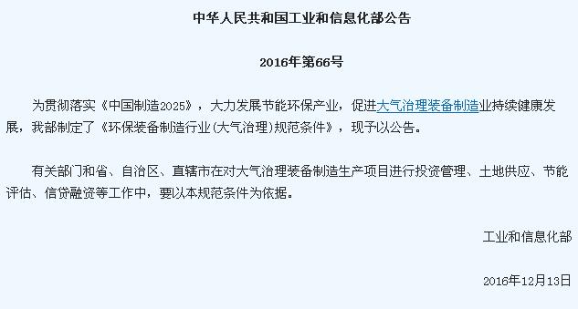 為貫徹落實《中國制造2025》,大力發(fā)展節(jié)能環(huán)保產(chǎn)業(yè),規(guī)范行業(yè)秩序,引導大氣治理裝備制造行業(yè)持續(xù)健康發(fā)展,工信部制定了《環(huán)保裝備制造行業(yè)大氣治理規(guī)范條件》條例。