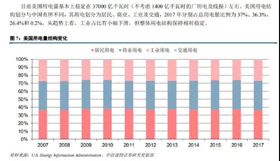 如果和美國比較的話,美國的電力消耗居民用電排名第一,然后是商業用電和工業用電。2017年占比分別為?37%、36.3%和26.4%,另外還有零點幾個百分點的交通用電。美國三大電力消耗來源中工業反而是最少的。下圖來自中信建投證券研究發展部。