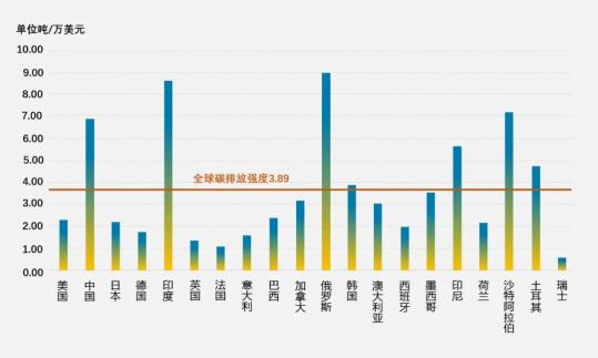 我國碳排放總量在2008年首度超過美國,2019年已接近美國的2倍,占全球總碳排放的27.2%,超過美國和歐盟的總和。人均碳排放量已超過歐盟,排名全球第二。如延續(xù)原有發(fā)展模式,將在短期內(nèi)超過美國。2019年,碳排放強度為6.88噸/萬美元,高出全球平均43%。