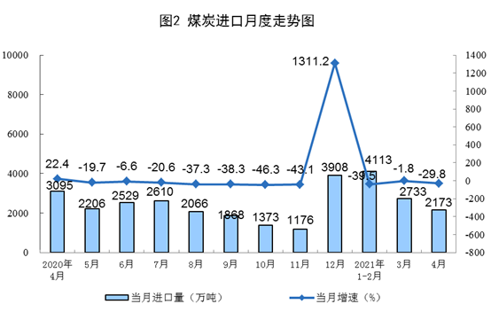 原煤生產(chǎn)有所下降。4月份,生產(chǎn)原煤3.2億噸,同比下降1.8%,比2019年4月份增長(zhǎng)4.0%,兩年平均增長(zhǎng)2.0%,日均產(chǎn)量1074萬(wàn)噸;進(jìn)口煤炭2173萬(wàn)噸,同比下降29.8%。