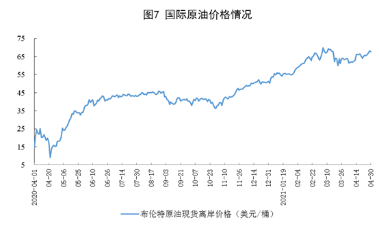 ? ? ? ?原油進(jìn)口由升轉(zhuǎn)降,國(guó)際原油價(jià)格有所上漲。4月份,進(jìn)口原油4036萬(wàn)噸,同比下降0.2%;1-4月份,進(jìn)口原油17958萬(wàn)噸,同比增長(zhǎng)7.2%。4月30日布倫特原油現(xiàn)貨離岸價(jià)格為67.73美元/桶,比3月31日的63.52美元/桶上漲6.6%。