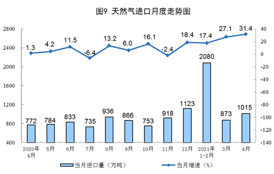 天然氣進(jìn)口增速加快。4月份,進(jìn)口天然氣1015萬(wàn)噸,同比增長(zhǎng)31.4%。1-4月份,進(jìn)口天然氣3946萬(wàn)噸,同比增長(zhǎng)22.4%。
