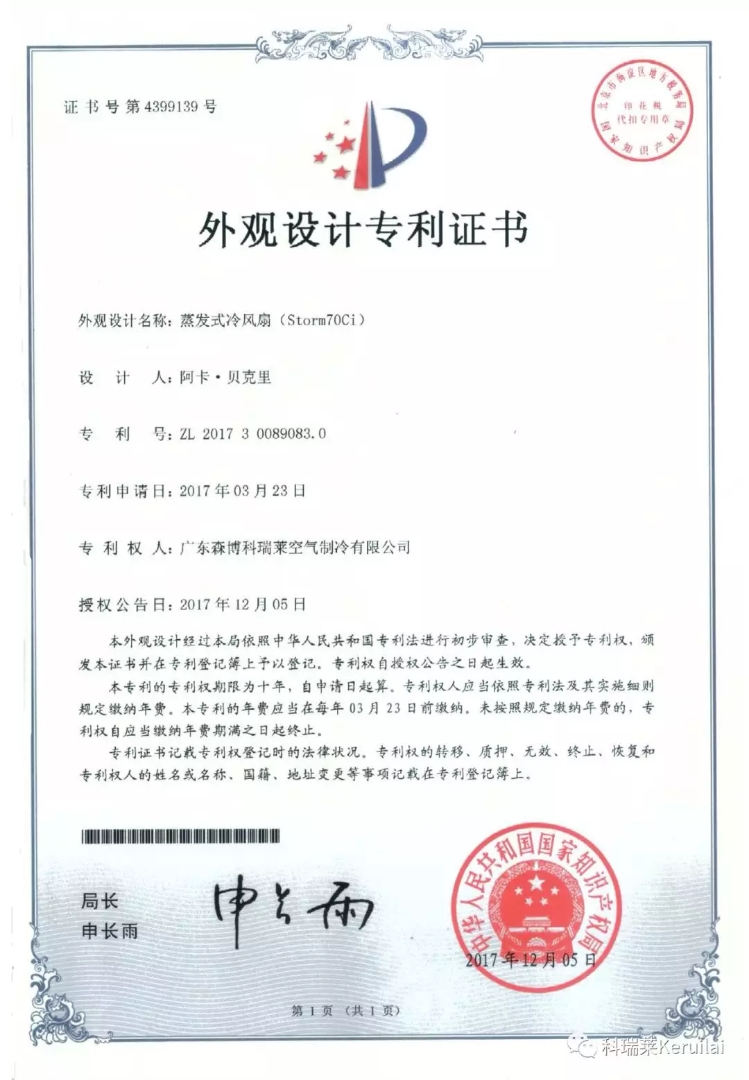 近期,科瑞萊冷風扇產(chǎn)品"風暴"憑借精美的外觀和優(yōu)良的品質(zhì),榮獲國家知識產(chǎn)權(quán)局頒發(fā)的外觀設計專利證書。