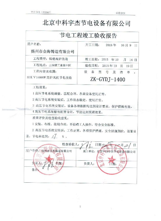 經過揚州金海鑄造管理人員的嚴格審核,中科宇杰智能風機節電系統的節能效率達到了17%按每度電0.5583元計算,每年可為企業節省114萬元的電費,投資回報期僅不到一年。這樣的節能金額遠超出了集團領導的節能預期,取得了極大的經濟效益和社會效益。